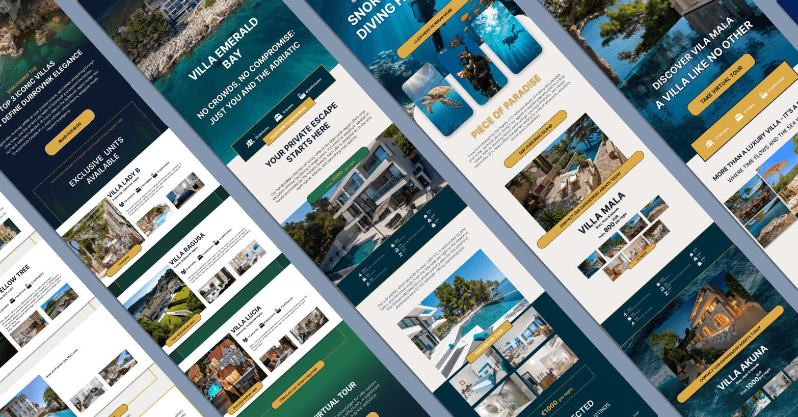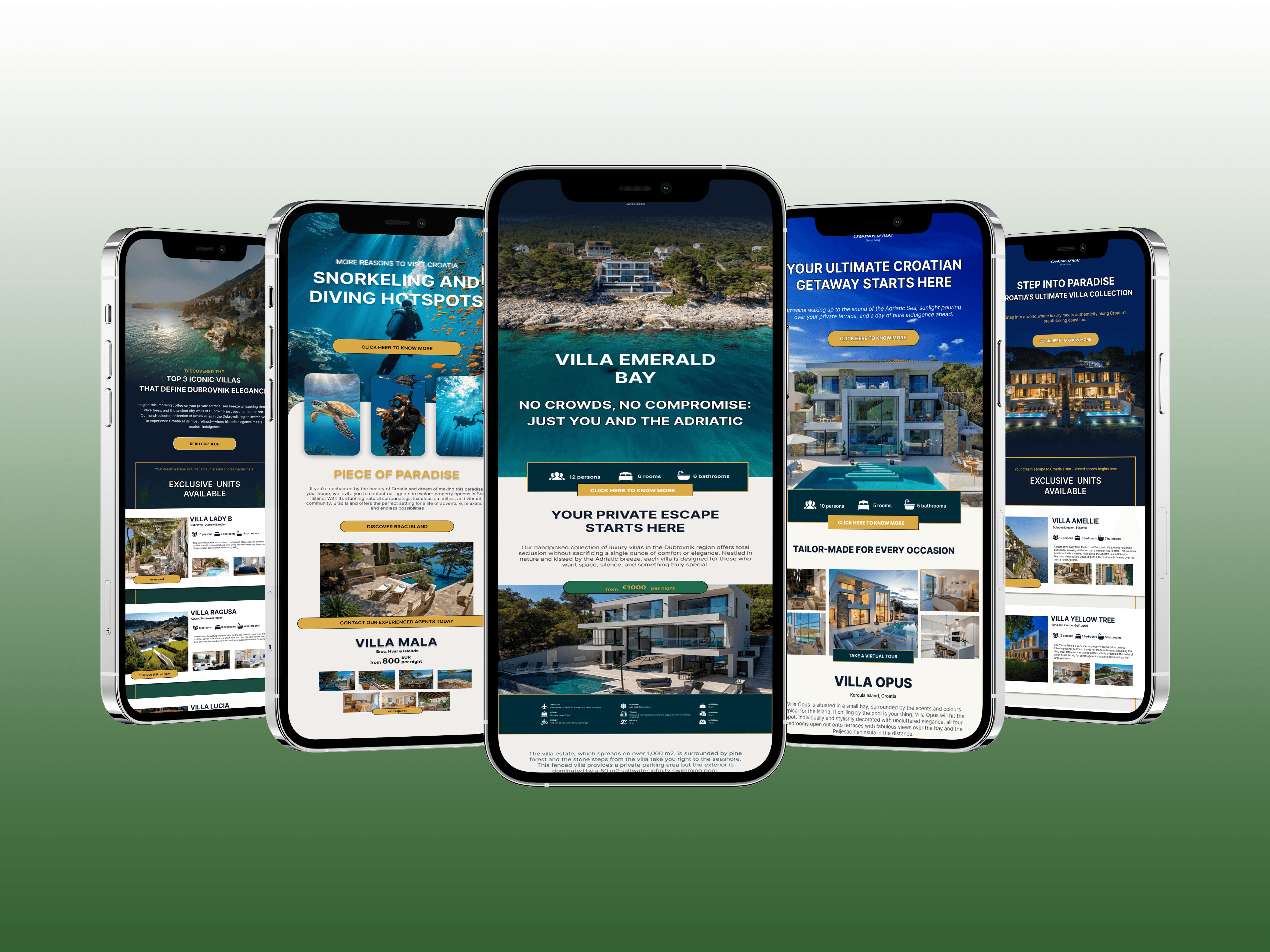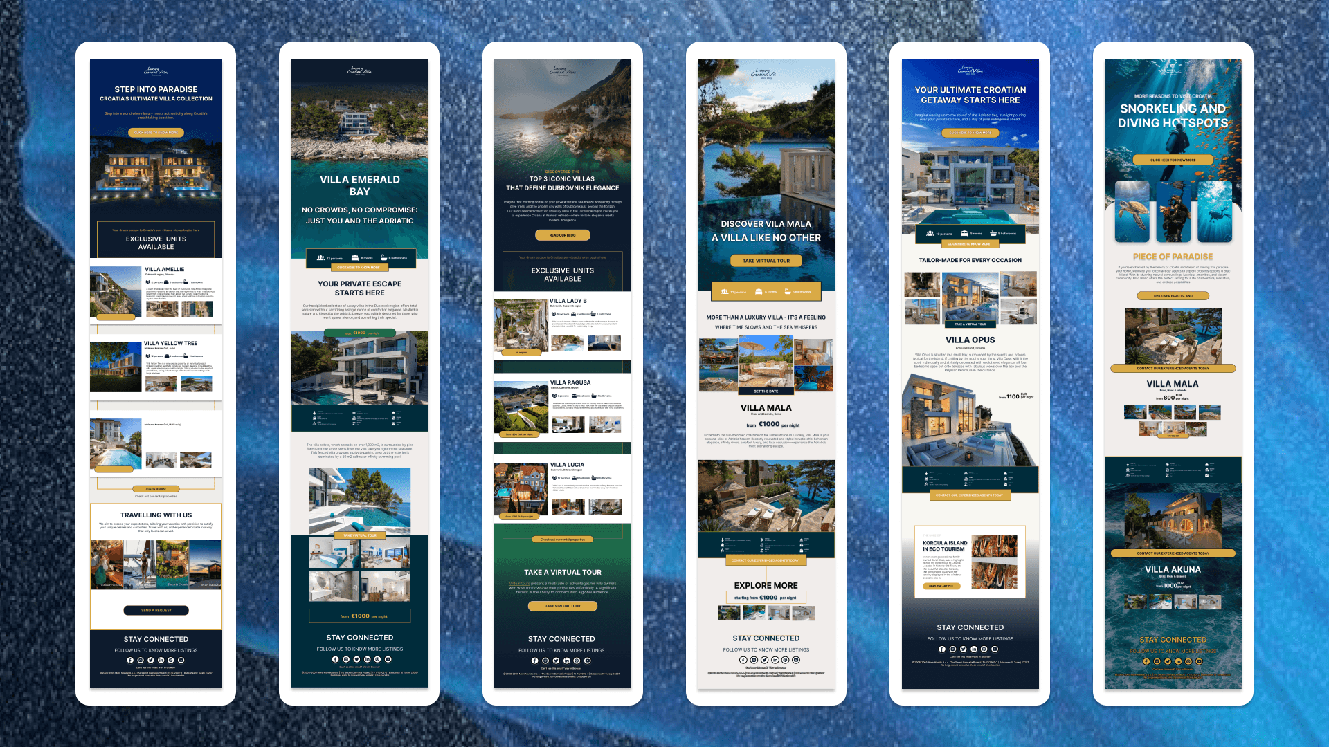 For My Luxoria, a luxury villa agency, I created a fully branded email template system designed to enhance both aesthetics and performance. Each template was built to communicate refinement while maintaining clarity and usability-combining elegant typography, spacious layouts, and a tone aligned with the brand’s premium positioning. The final system ensures visual consistency across campaigns while supporting a high-touch, conversion-focused customer journey.